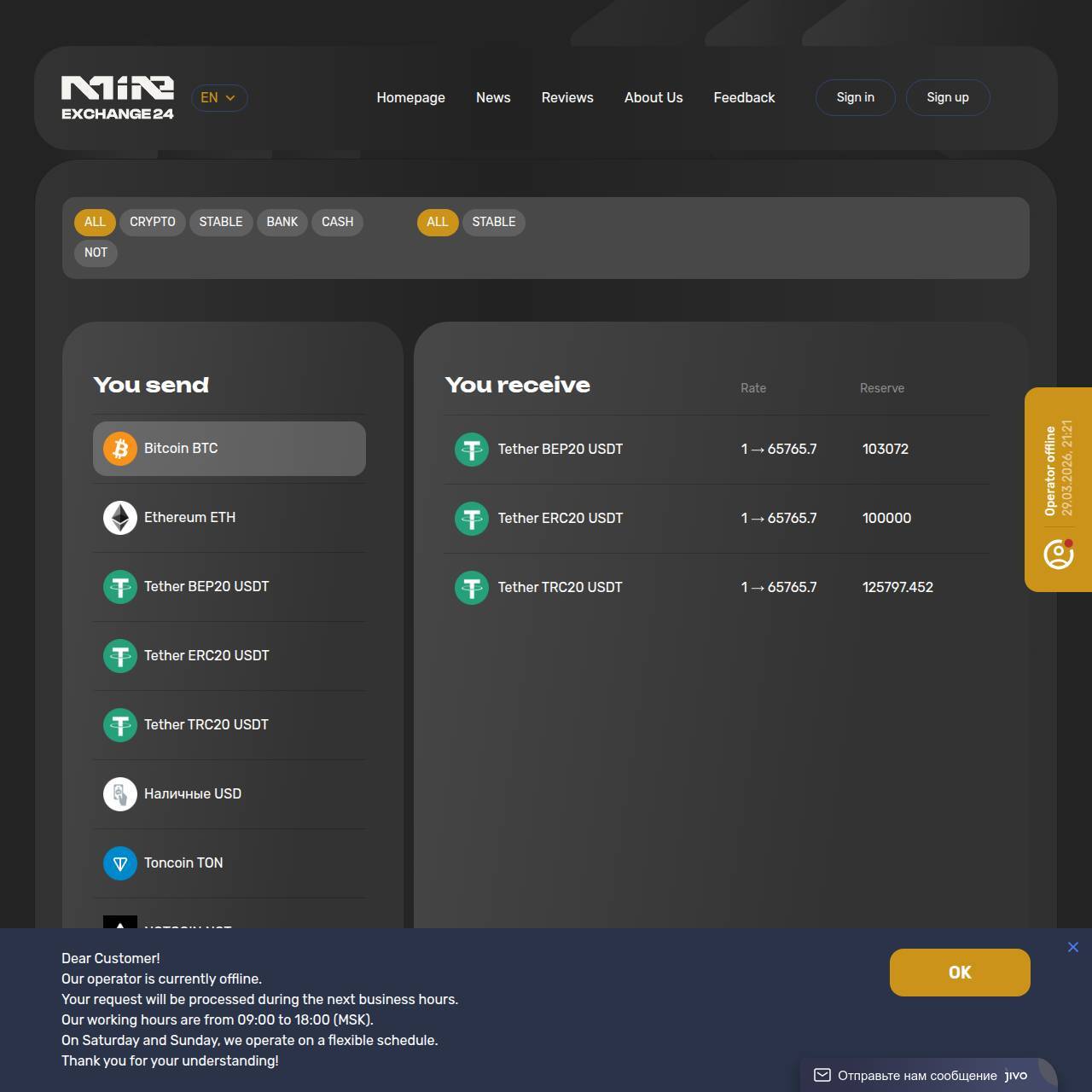 Добро пожаловать в MirExchange24 - сервис обмена криптовалют, где скорость, безопасность и прозрачность являются основой каждой сделки. Мы предлагаем удобный и понятный интерфейс, позволяющий быстро и без лишних сложностей совершать обмены.