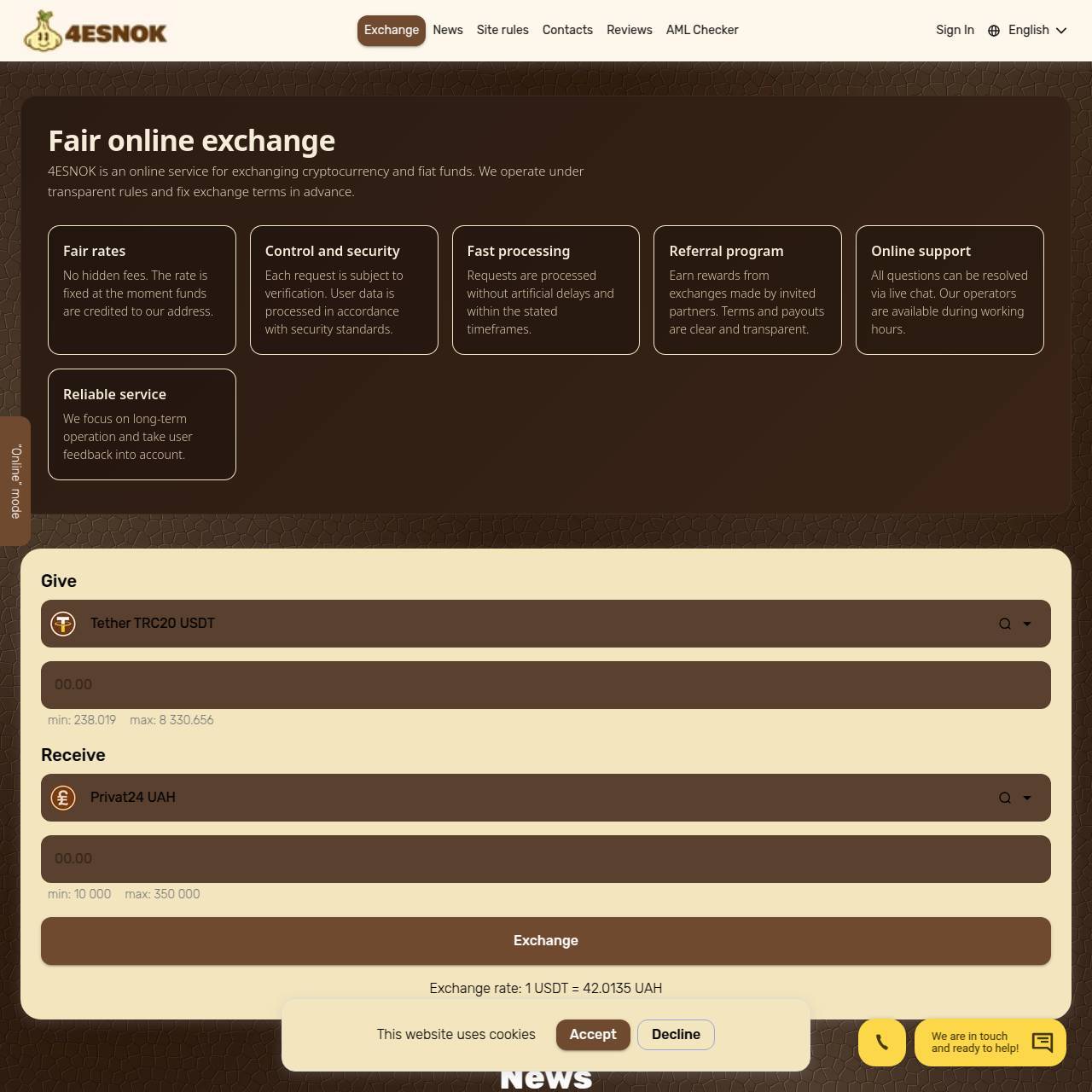4ESNOK — сервис обмена криптовалют и фиатных средств. Мы работаем по прозрачным правилам и заранее фиксируем условия сделки.