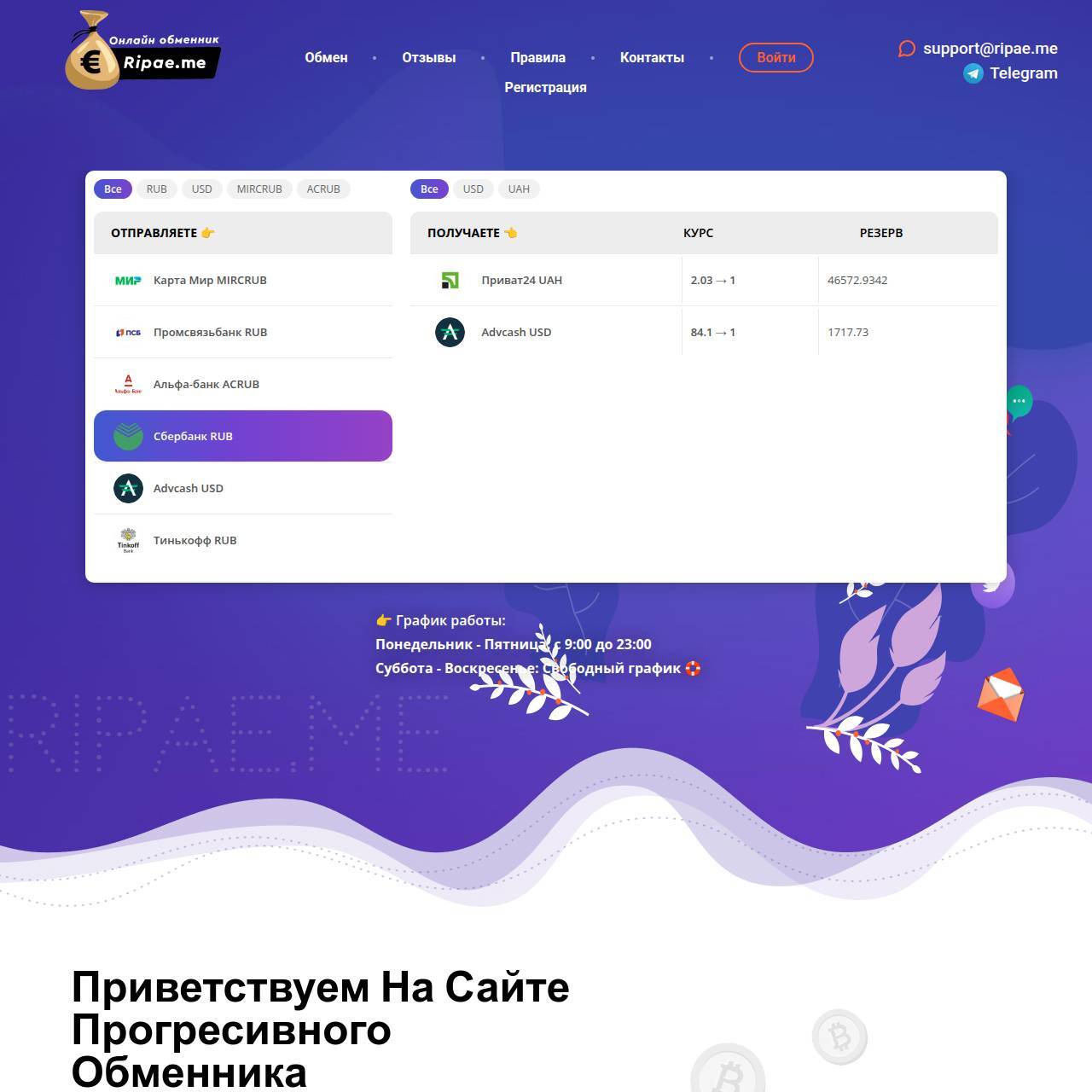 Наш On-line сервис предназначен для тех, кто хочет быстро, безопасно и по выгодному курсу обменять такие виды электронных валют: BTC, Ethereum, Qiwi, РНКБ, Тинькофф, Сбербанк, Приват24, Visa/Master Card, Advcash, БелБанк.
