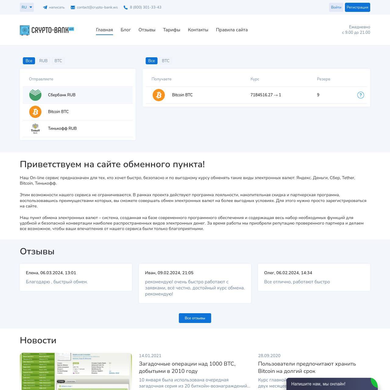 Наш сайт уже доступен для работы и обмена криптовалют: мы проводим быстрые и надёжные операции по парам BTC/RUB и USDT/RUB.