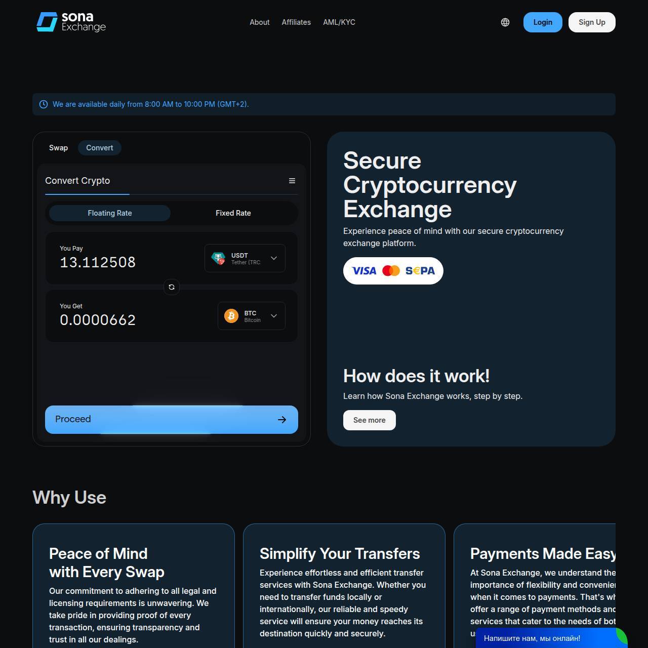 Оцените бесшовные конвертации криптовалюты в криптовалюту и фиатные валюты на нашей платформе. Мы стремимся ежедневно расширять наши предложения, добавляя новые валюты, монеты и токены для удовлетворения ваших растущих потребностей. По мере нашего роста мы будем использовать передовые технологии, такие как блокчейн и Web3, для предоставления инновационных услуг для продвинутого криптосообщества. Безопасность является нашим главным приоритетом. Наша некастодиальная платформа гарантирует, что вы сохраняете полный контроль над своими средствами, обеспечивая безопасный и эффективный процесс торговли.