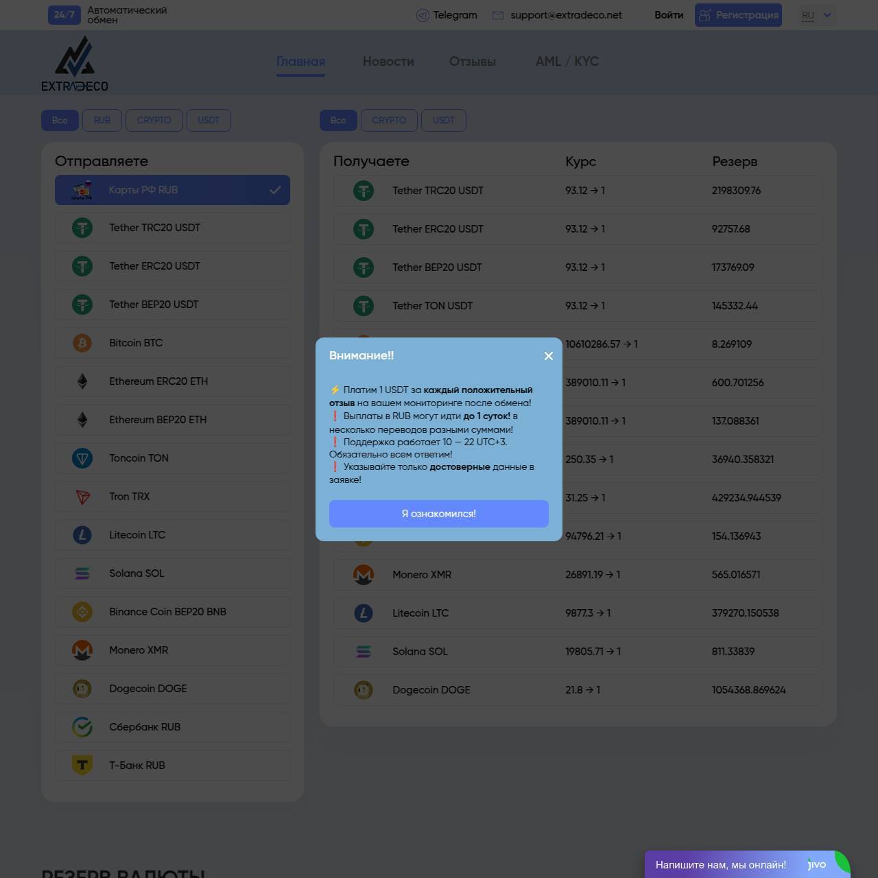 Криптообменник ExTradeCo — безопасный автоматический онлайн-обмен криптовалюты и фиата. Сервис предлагает возможность покупки или продажи криптовалюты за рубли, доллары или другие валюты на ваш кошелек. Для обмена можно использовать любую банковскую карту или другие способы оплаты. В отличие от p2p сервисов, наша система работает автономно и практически не нуждается в человеческом участии. Кроме того, в отличие от криптовалютных бирж, мы не требуем верификации для осуществления обмена, что обеспечивает полную конфиденциальность!