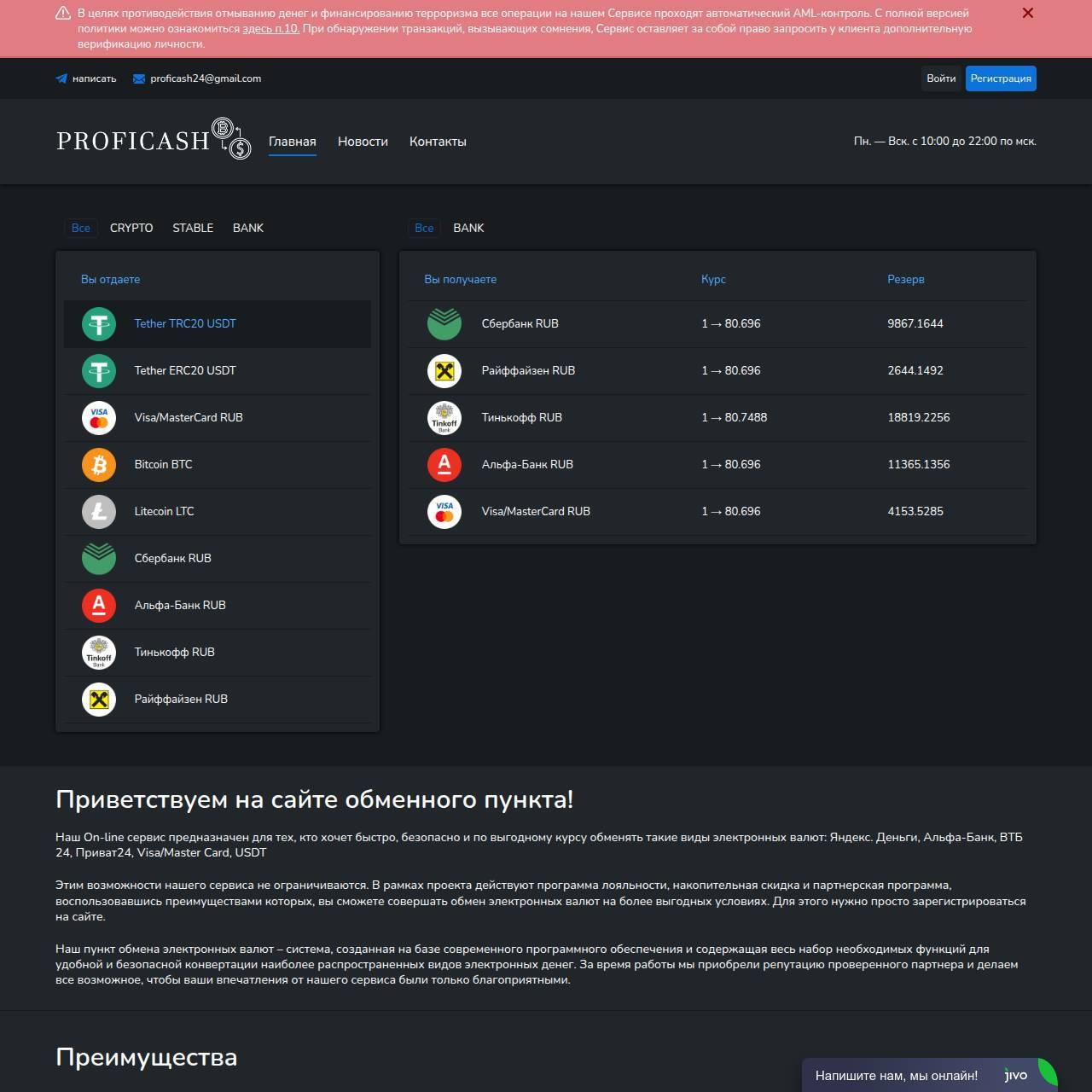 Наш On-line сервис предназначен для тех, кто хочет быстро, безопасно и по выгодному курсу обменять такие виды электронных валют: Яндекс. Деньги, Альфа-Банк, ВТБ 24, Приват24, Visa/Master Card, USDT