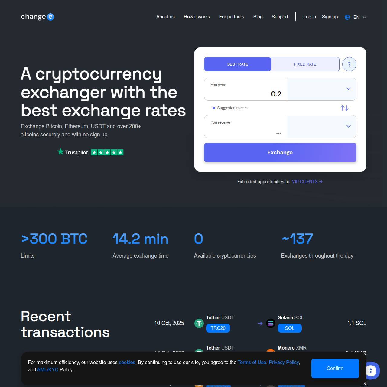 Changee - это современный обменный сервис с новой системой выбора курса, которая определяет для Вас наилучший обменный курс. Наша система проста в использовании и абсолютно прозрачна. Мы всегда даем нашим клиентам возможность всего за пару кликов обменивать криптовалюту анонимно, безопасно и выгодно. Вокруг нашего сервиса мы хотим создать преданное сообщество тех, кто ценит свое время и деньги. Поэтому мы будем рады любым предложениям и отзывам о нашем сервисе.