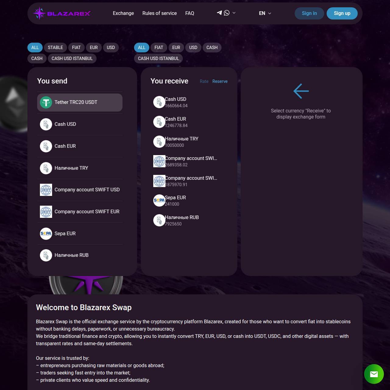 Blazarex Swap — это официальный сервис от криптовалютной платформы Blazarex, созданный для тех, кто хочет обменивать фиат на стейблкоины без банковских задержек, сложных форм и лишней бюрократии.