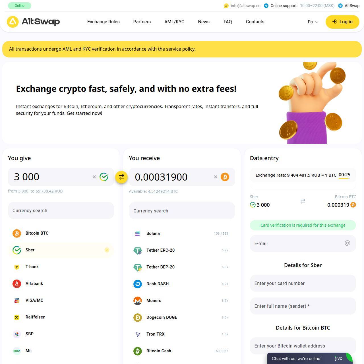 Моментальные обмены Bitcoin, Ethereum и других криптовалют. Прозрачные курсы, мгновенные переводы и полная безопасность ваших средств. Начни прямо сейчас!
