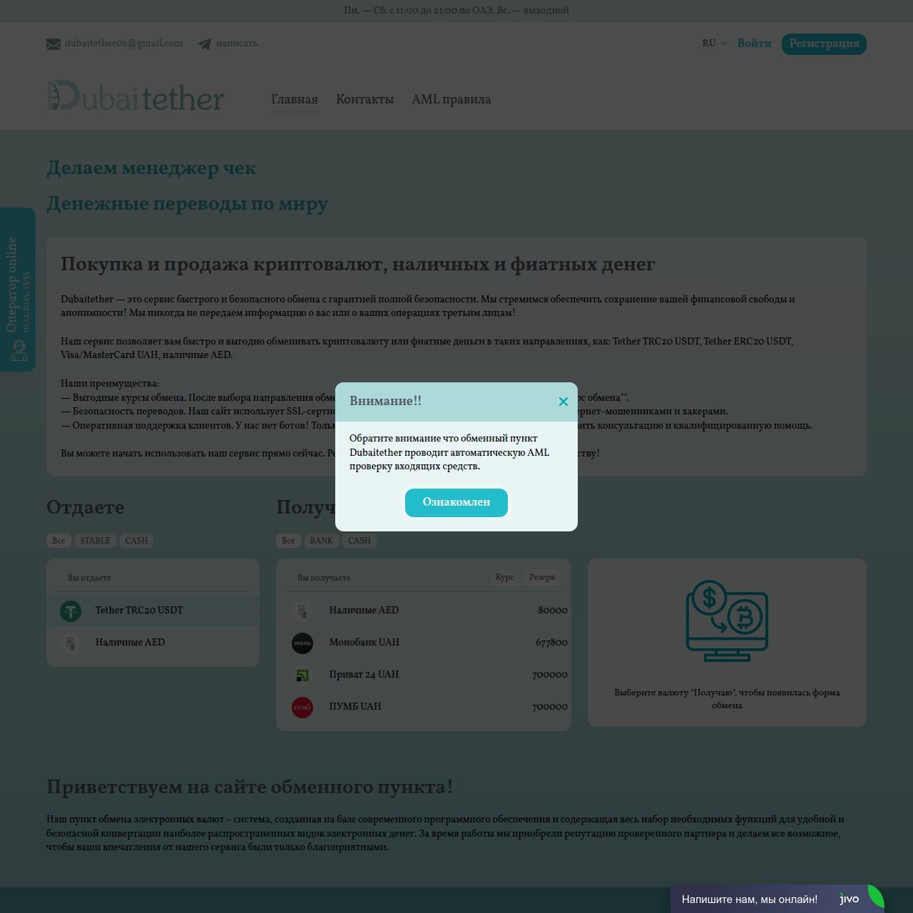 Dubaitether — это сервис быстрого и безопасного обмена с гарантией полной безопасности. Мы стремимся обеспечить сохранение вашей финансовой свободы и анонимности! Мы никогда не передаем информацию о вас или о ваших операциях третьим лицам!